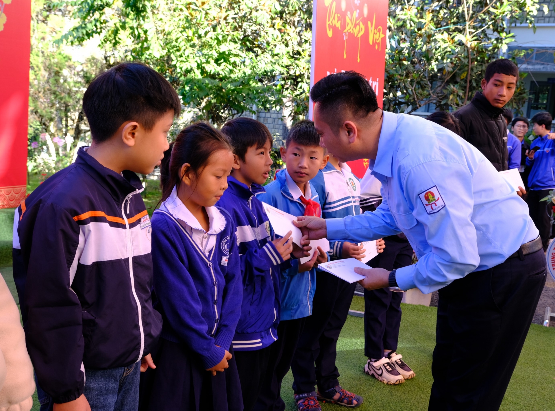 Anh Lê Anh Quân - Phó Chủ tịch Hội Đồng Đội Trung ương tặng học bổng cho các em học sinh vượt khó học giỏi tỉnh Lâm Đồng