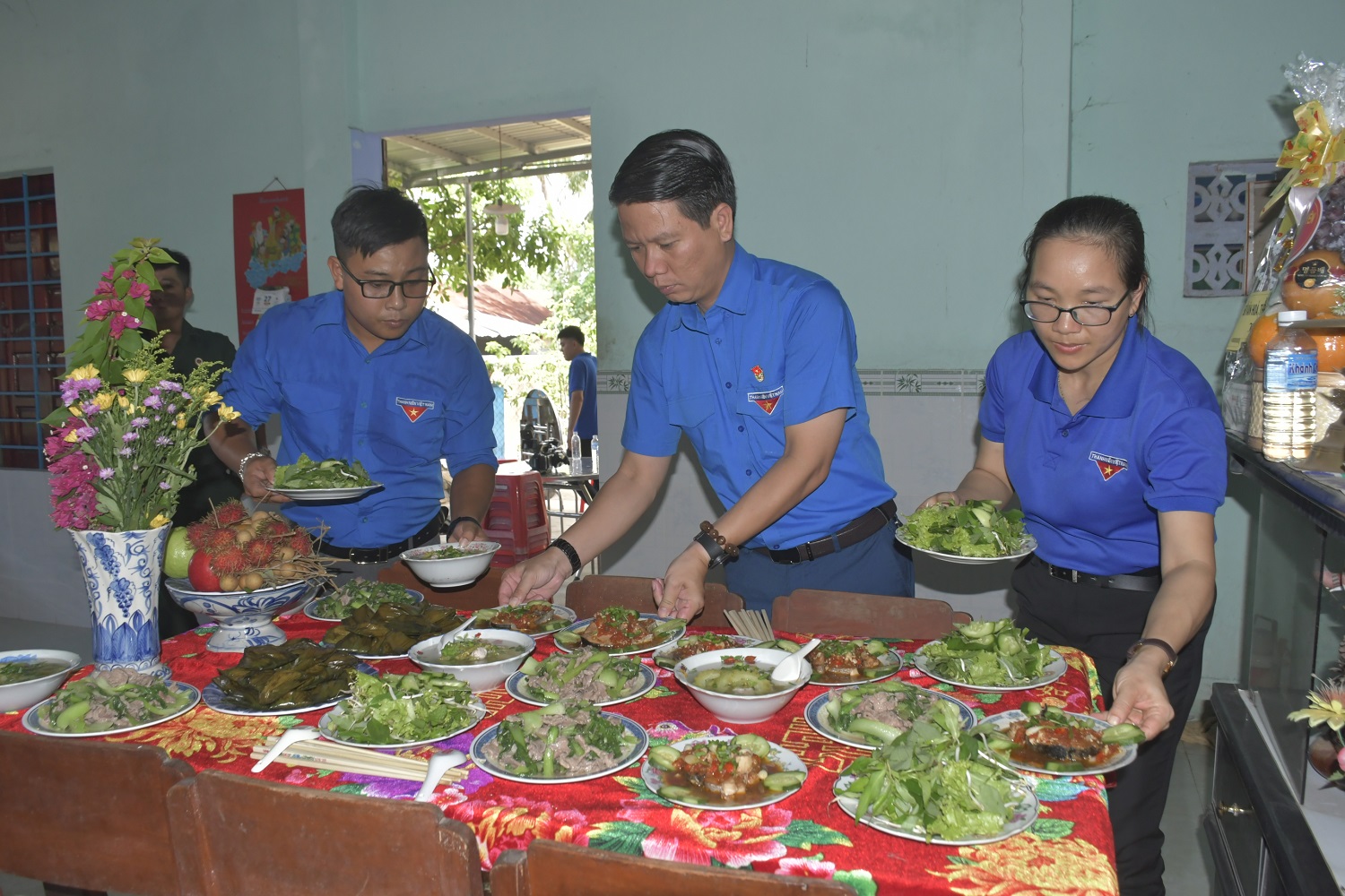 Tại nhà Mẹ, đoàn viên, thanh niên các đơn vị đã đi chợ mua thực phẩm về chế biến “Bữa cơm nghĩa tình” cùng Mẹ Việt Nam Anh hùng Nguyễn Thị Xạ và gia đình mẹ có một bữa cơm đầy nghĩa tình, ấm áp.