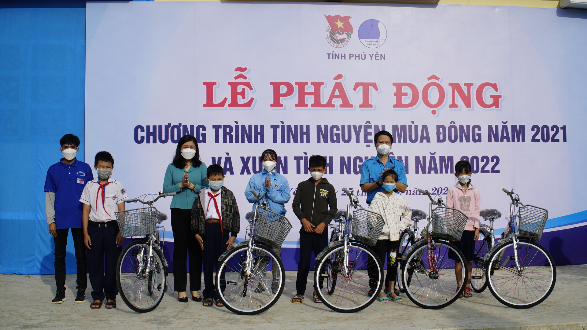 Đồng chí Nguyễn Thị Hoài My - Phó Trưởng Ban Tuyên giáo Tỉnh ủy và anh Lương Minh Tùng - Phó Bí thư Tỉnh Đoàn, Chủ tịch Hội LHTN Việt Nam tỉnh Phú Yên tặng xe đạp cho các em thiếu nhi có hoàn cảnh khó khăn, vượt khó học giỏi.