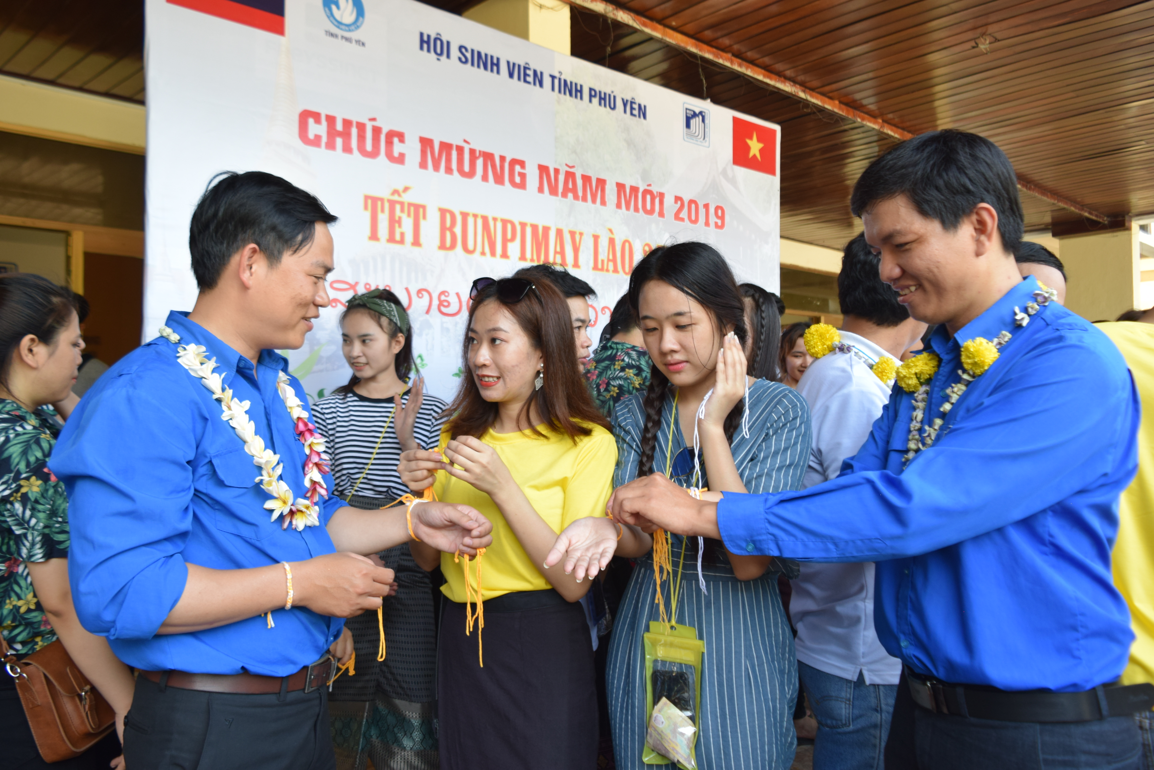 Nghi thức buộc vào cổ tay của các bạn sinh viên Lào và sinh viên các trường nhằm gửi lời chúc hạnh phúc và sức khỏe nhân dịp Tết cổ truyền Bunpimay Lào