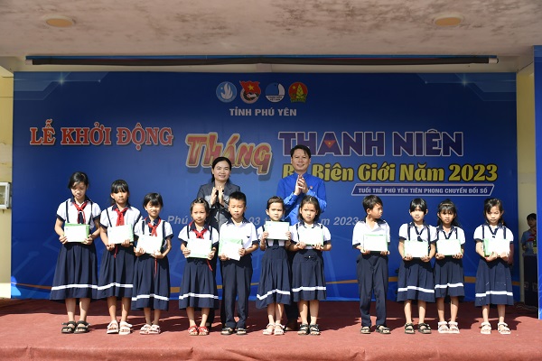 Lãnh đạo Ban Dân vận Tỉnh ủy và Thường trực Tỉnh Đoàn tặng quà cho các em học sinh có hoàn cảnh khó khăn.
