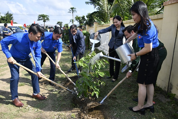 Lãnh đạo Ban Dân vận Tỉnh ủy và Thường trực Tỉnh Đoàn trồng cây xanh tại Trường TH&THCS Xuân Lâm.