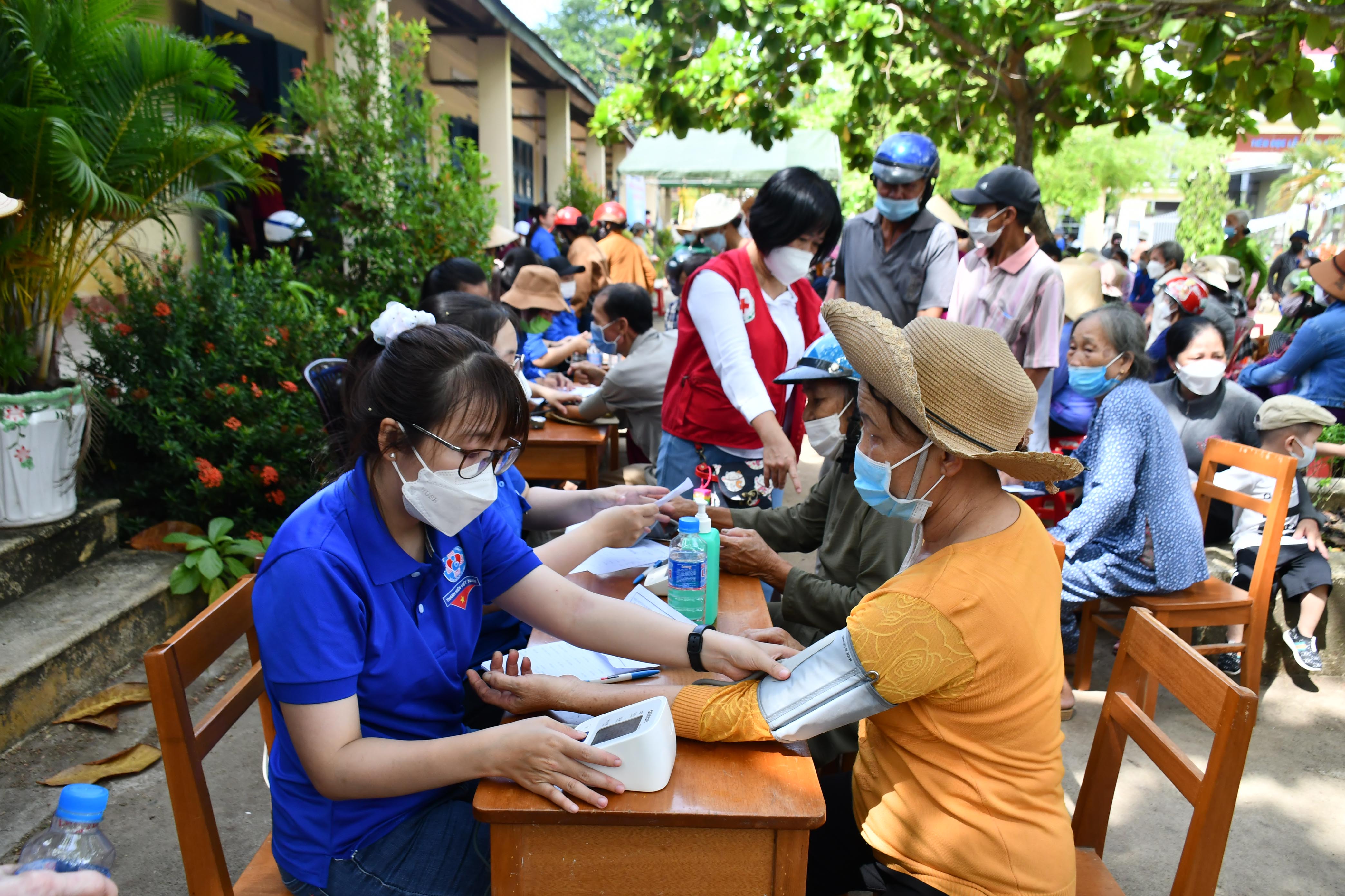 Đoàn công tác cùng đội ngũ bác sỹ và nhân viên y tế cùng lực lượng đoàn viên, thanh niên tình nguyện tham gia khám bệnh cho bà con Nhân dân