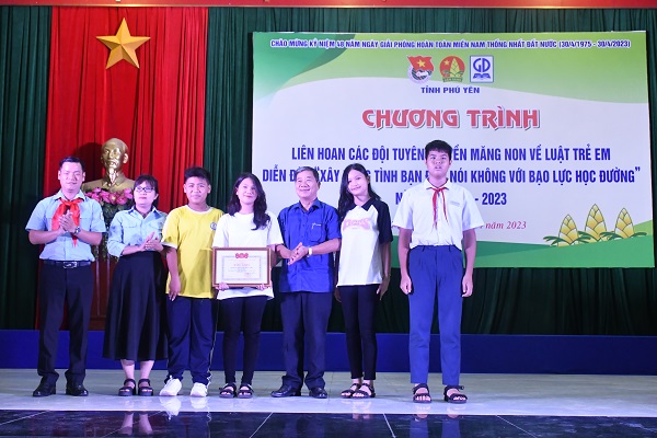 Lãnh đạo Ban Dân vận Tỉnh ủy và Thường trực Tỉnh Đoàn, Hội đồng Đội tỉnh trao giải nhất cho Hội đồng Đội TP Tuy Hòa tại Liên hoan các đội tuyên truyền măng non về Luật Trẻ em.