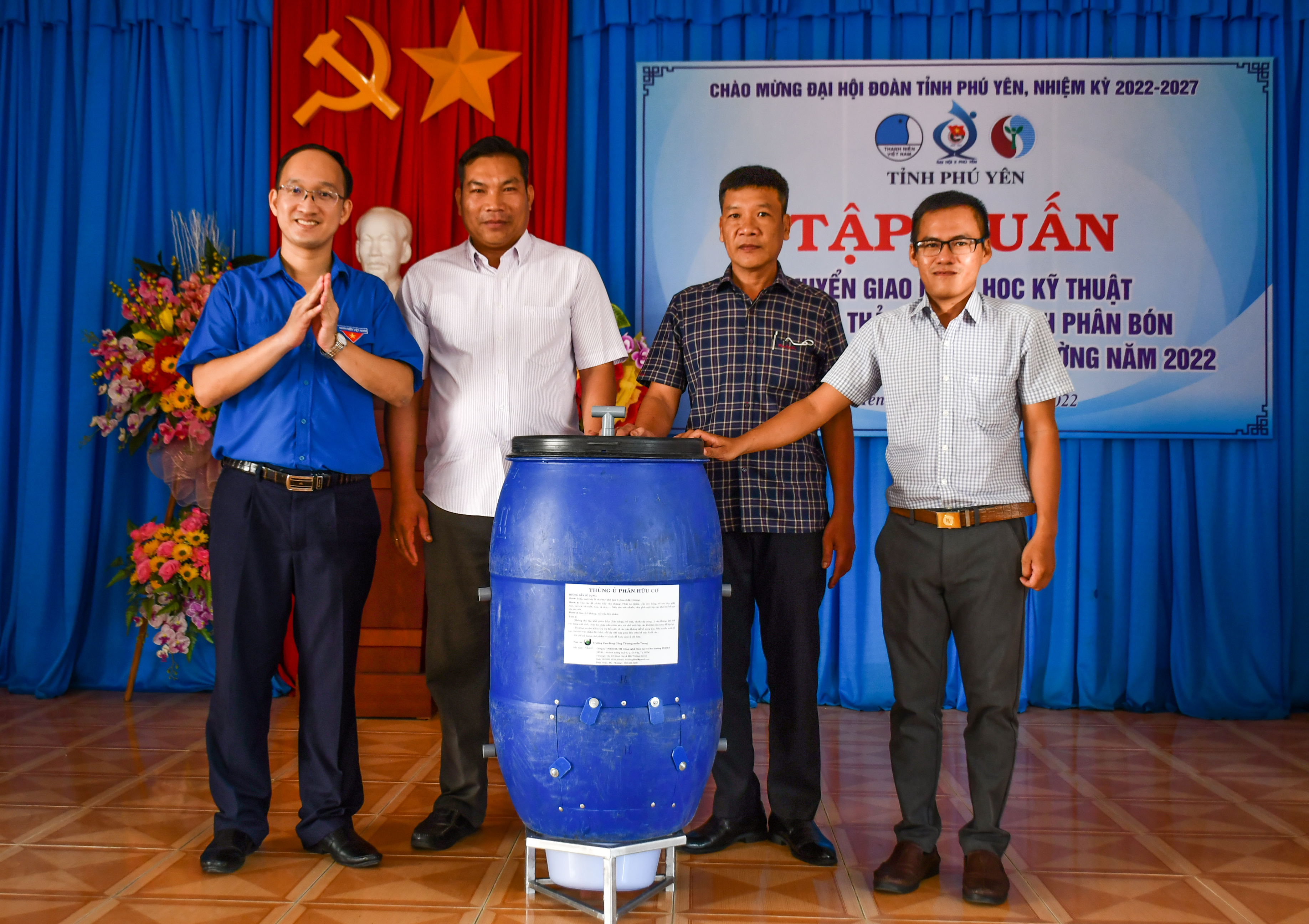 Đồng chí Trần Minh Trí - Phó Bí thư Tỉnh Đoàn trao tặng thùng chuyên dụng ủ rác hữu cơ thành phân bón cho lãnh đạo UBND xã An Phú (thành phố Tuy Hòa)