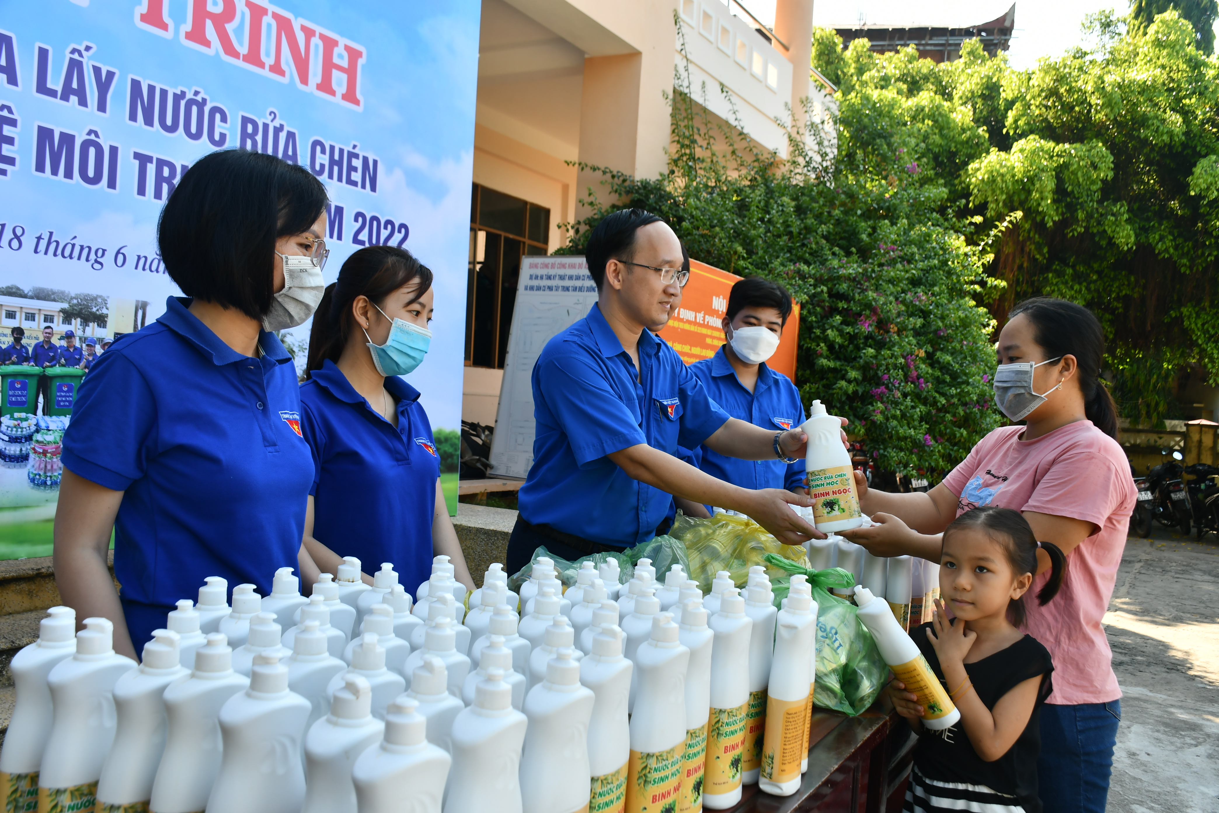Đoàn viên, thanh niên tham gia gian hàng đổi ve chai lấy nước rửa chén sinh học cho bà con nhân dân trên địa bàn thành phố Tuy Hòa