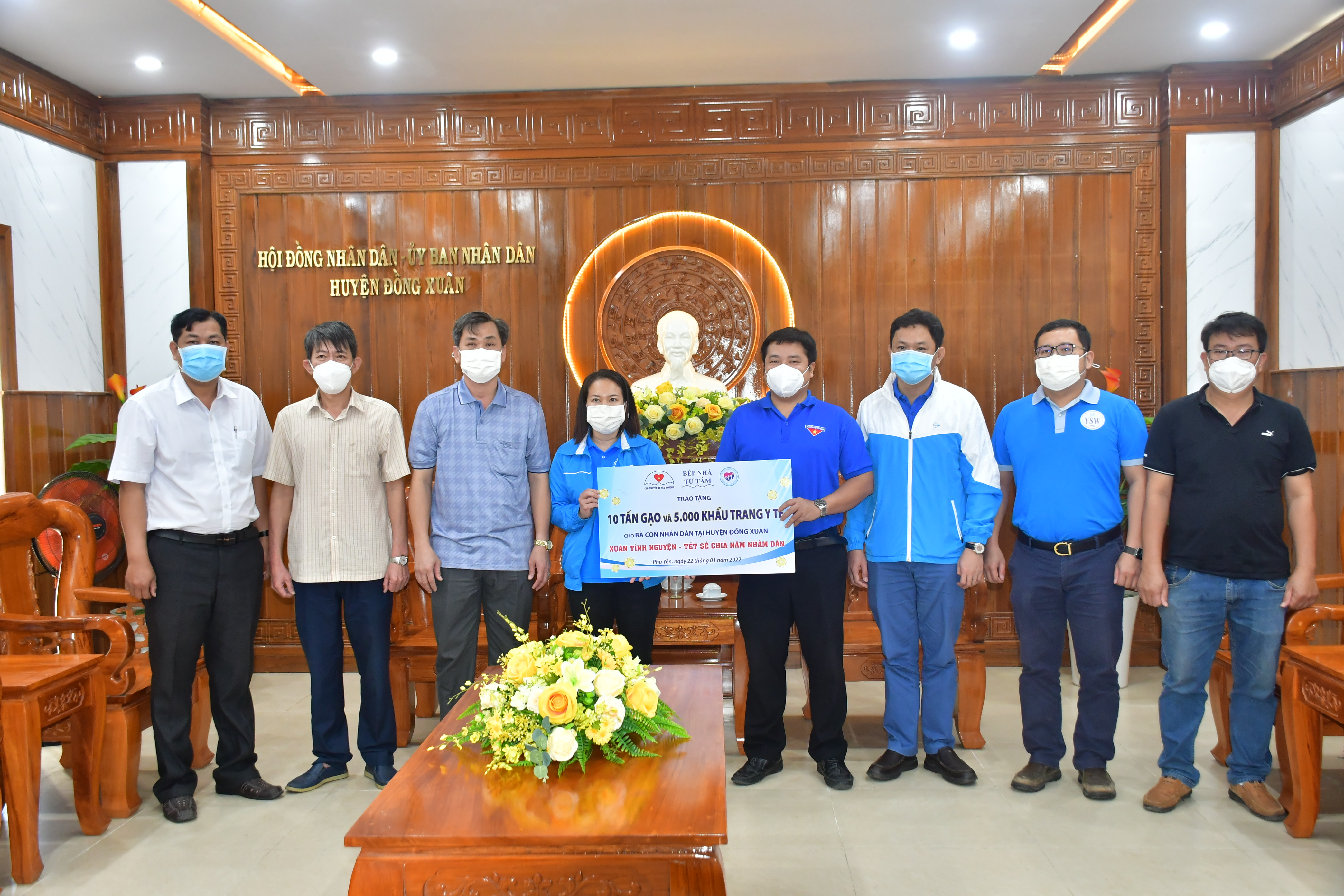 Đoàn trao tặng bảng tượng trưng hỗ trợ gạo và khẩu trang y tế cho lãnh đạo địa phương huyện Đồng Xuân để hỗ trợ bà con nhân dân