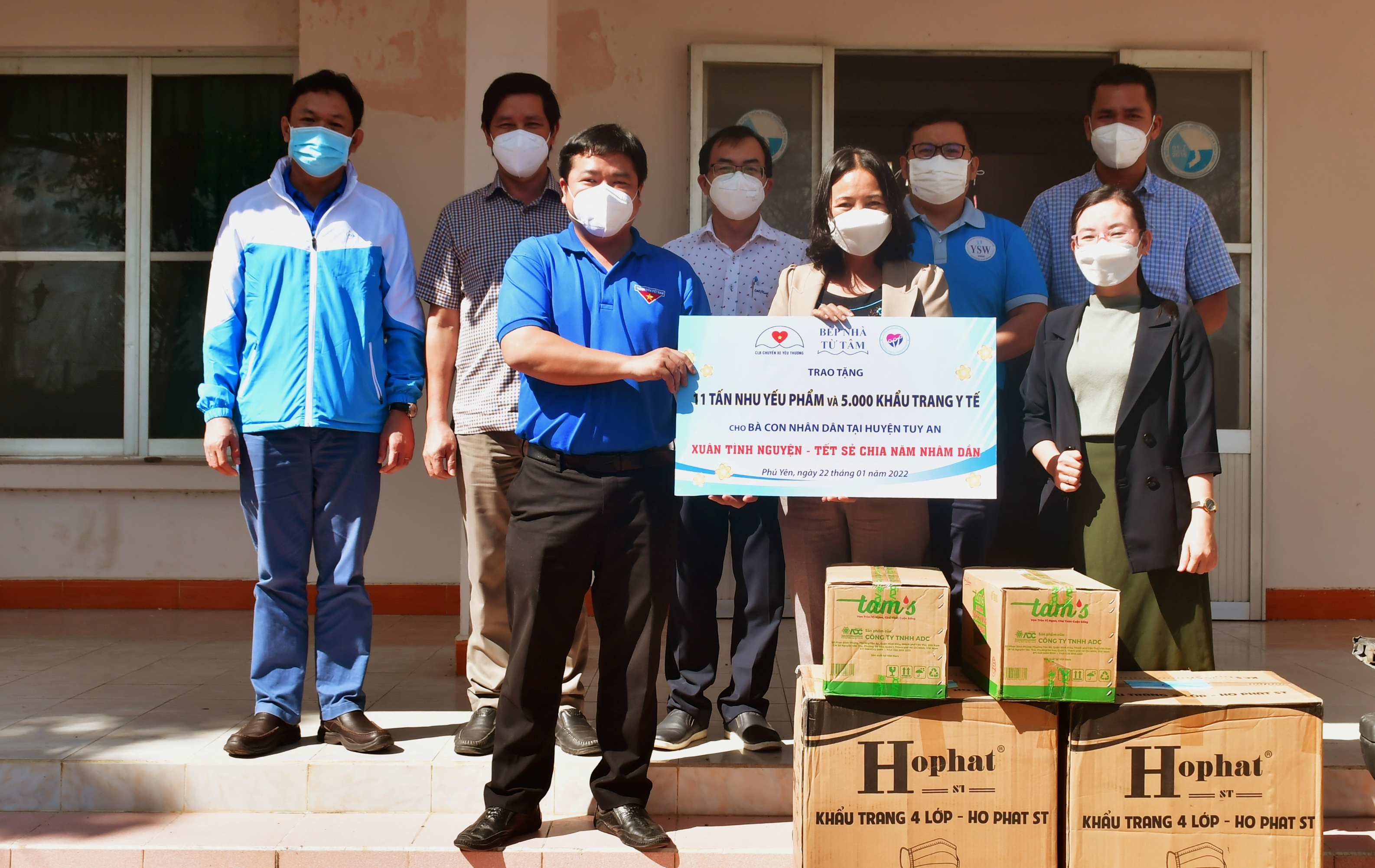 Số nhu yếu phẩm và trang thiết bị y tế trên được phân bổ như sau: huyện Sơn Hòa (12 tấn gạo, 500 chai nước tương, 2.500 khẩu trang y tế); thị xã Sông Cầu (10 tấn gạo, 5.000 khẩu trang y tế); huyện Đồng Xuân (10 tấn gạo, 5.000 khẩu trang y tế); huyện Tuy An (10 tấn gạo, 1.000 chai nước tương, 5.000 khẩu trang y tế); huyện Sông Hinh (03 tấn gạo, 1.000 chai nước tương, 5.000 khẩu trang y tế); thành phố Tuy Hòa (2.000 chai nước tương, 5.000 khẩu trang y tế); phường Phú Thạnh, thành phố Tuy Hòa (05 tấn gạo và 25.000.000 đồng); Bếp nhà Từ tâm (05 tấn gạo, 1.000 chai nước tương); Ban bảo vệ chăm sóc sức khỏe tỉnh Phú Yên (10.000 khẩu trang và 200 bộ quần áo bảo hộ)…