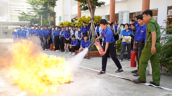Thực hành, hướng dẫn việc sử dụng bình chữa cháy và một số thiết bị chữa cháy cho đoàn viên, thanh niên.