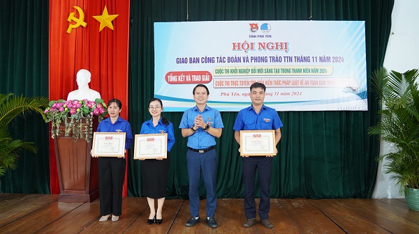 Thường trực Tỉnh Đoàn trao giải nhất Cuộc thi khởi nghiệp đổi mới sáng tạo trong thanh niên năm 2024 cho tác giả Hồ Phúc Phấn, xã An Ninh Tây, huyện Tuy An, với Dự án “Sản phẩm dầu hổ lộc vàng”.