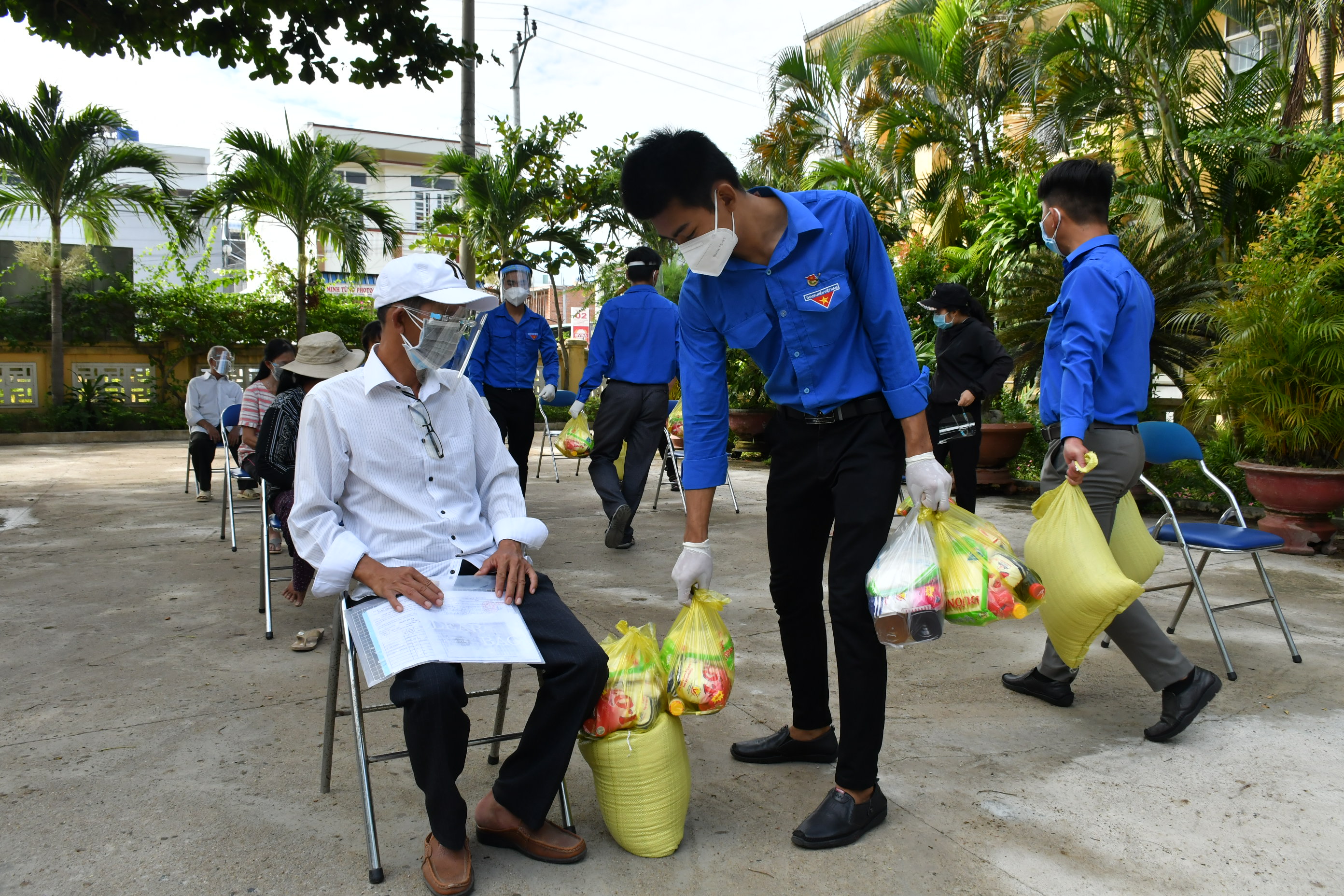 Tình nguyện viên phân phối gạo hỗ trợ cho người dân