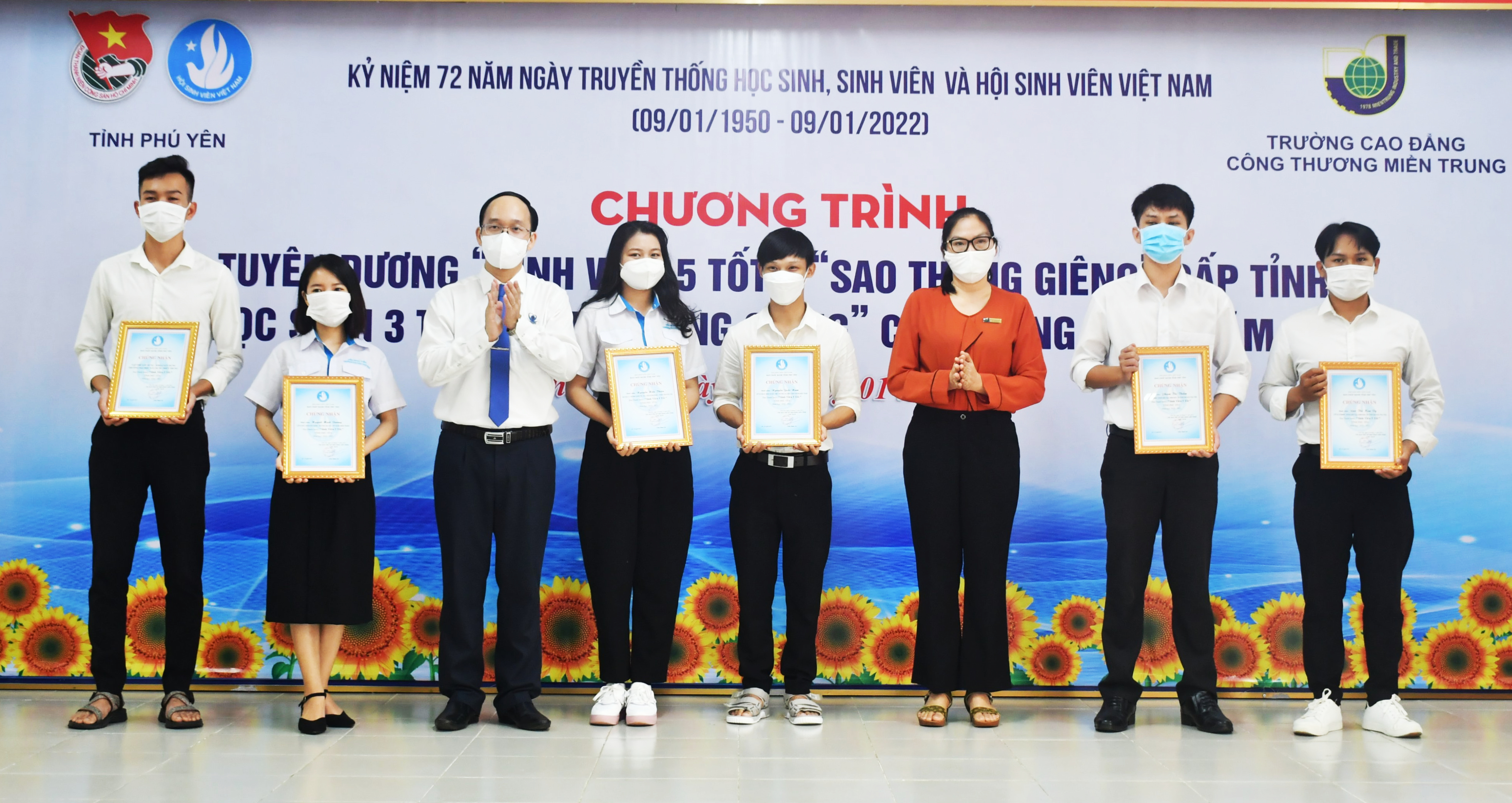 Đồng chí Trần Minh Trí - Phó Bí thư Tỉnh Đoàn, Chủ tịch Hội Sinh viên Việt Nam tỉnh và lãnh đạo Trường Cao đẳng Công Thương Miền Trung trao danh hiệu “Sinh viên 5 tốt” cấp tỉnh cho các sinh viên