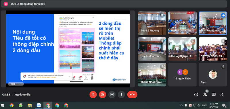 Tại hội nghị, Báo cáo viên Lê Hồng Đức - Trưởng phòng Giải pháp quảng cáo, Công ty công nghệ Haravan đã chia sẻ nhiều kiến thức bổ ích cho các bạn sinh viên về các kỹ năng số ứng dụng công nghệ thông tin, chuyển đổi số cho sinh viên ứng dụng trong học tập; các thông tin dành cho quản trị viên các trang fanpage của Đoàn về các thủ thuật của facebook, định hướng xây dựng các bài viết trên fanpage, kỹ năng quản trị fanpage của tổ chức Đoàn, góp phần nhằm nâng cao công tác tuyên truyền trong thời gian sắp tới và các kỹ năng sử dụng mạng xã hội an toàn, hiệu quả.
