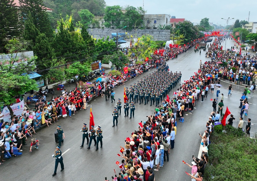 Bộ đội diễu hành trên đường phố trong sự cổ vũ nồng nhiệt của đông đảo người dân địa phương trong dịp kỷ niệm 70 năm Chiến thắng Điện Biên Phủ (7-5-1954/7-5-2024).