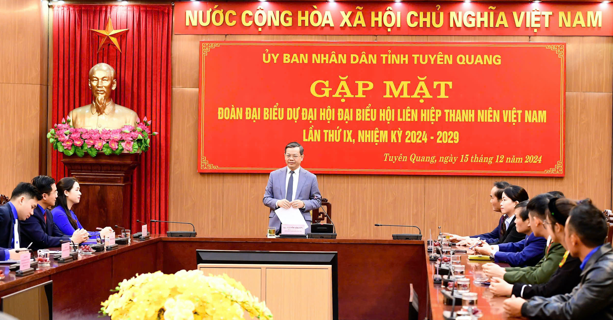 Phát biểu tại buổi gặp mặt, đồng chí Chủ tịch UBND tỉnh Nguyễn Văn Sơn chúc mừng và giao nhiệm vụ cho các đại biểu tham dự Đại hội nêu cao tinh thần trách nhiệm, đem nguyện vọng của tuổi trẻ tỉnh nhà đến với đại hội. Đoàn đại biểu cần phát huy tinh thần đoàn kết, thống nhất, tập trung trí tuệ, có nhiều ý kiến đóng góp thể hiện tiếng nói đại diện cho tuổi trẻ Tuyên Quang vào văn kiện và các nội dung tại đại hội; quảng bá hình ảnh quê hương và con người Tuyên Quang đến với bạn bè trong nước, quốc tế. Đồng thời, học hỏi những mô hình hay, cách làm hiệu quả để áp dụng trong triển khai thực hiện nhiệm vụ trong công tác hội và phong trào thanh niên tỉnh nhà.
