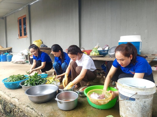 Bữa cơm được chuẩn bị tươm tất gồm nhiều món ăn quê hương như chắt chắt, thịt luộc, chả lụa, cá kho , cà ri, gà quê, món xào chua ngọt,… Bên mâm cơm, các bạn ĐVTN được Mẹ kể về những câu chuyện về những năm tháng kháng chiến của quân và dân trong xã, kỷ niệm về những người con đã hy sinh xương máu của mình cho Tổ quốc.