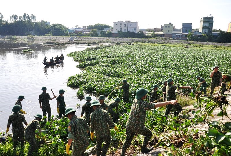 Lực lượng xung kích quyết tâm dọn sạch lớp bèo tây ken kín mặt hồ điều hòa