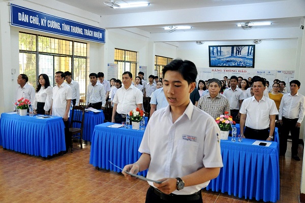 Phát biểu tại buổi lễ, Bí thư Huyện ủy Nghĩa Hành Trần Đình Cảm đã chúc mừng 6 học sinh là đoàn viên ưu tú vinh dự được đứng trong hàng ngũ của Đảng sau một thời gian dài phấn đấu.