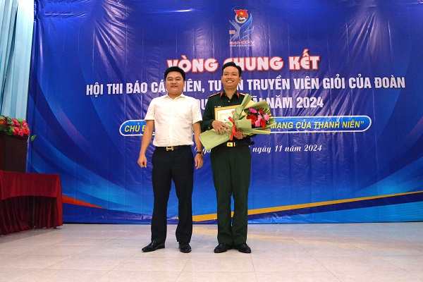 Phó Bí thư Thường trực Tỉnh đoàn Trần Đăng Minh trao giải nhất cho Đồng chí Lê Tuấn Bửu, Trợ lý công tác quần chúng, Bộ CHQS tỉnh.