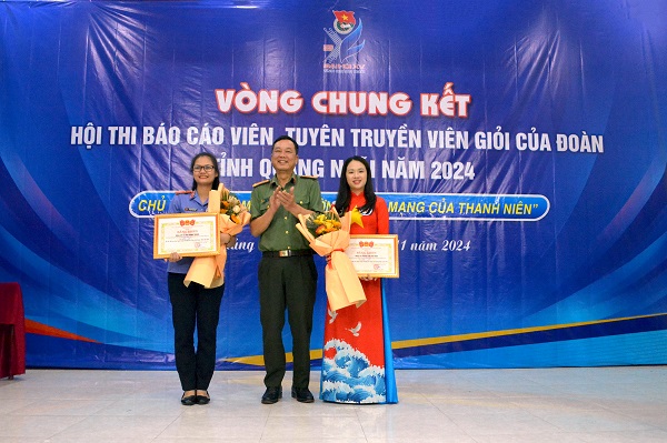 Thượng tá Trần Minh Hưng, Trưởng phòng An ninh chính trị nội bộ, Công an tỉnh, giám khảo hội thi trao giải nhì cho các thí sinh.