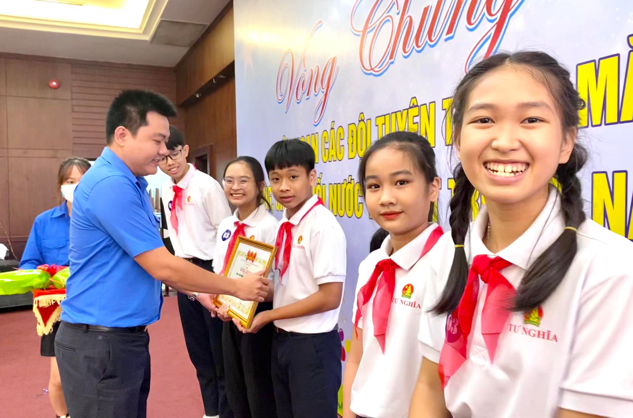 Anh Trần Đăng Minh, Phó Bí thư Tỉnh đoàn trao giải nhất cho đội tuyên truyền măng non huyện Tư Nghĩa.