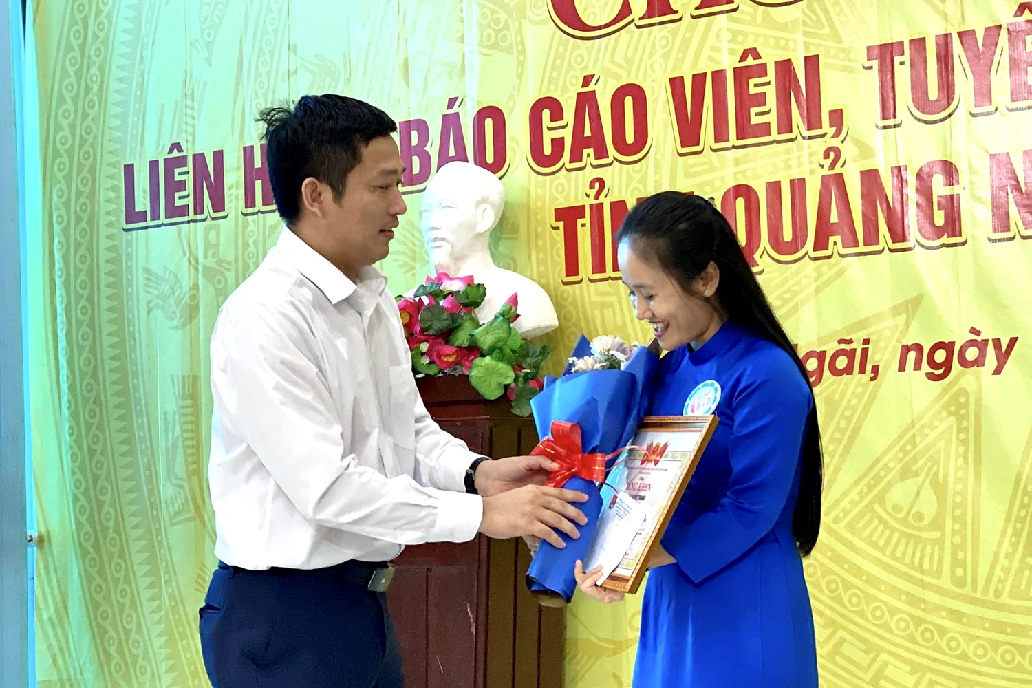 Đồng chí Cao Lê Tùng Nghĩa, Bí thư Tỉnh đoàn, Trưởng Ban tổ chức liên hoan trao giải Nhất cho thí sinh Lê Kiều Trang đơn vị Sơn Hà.