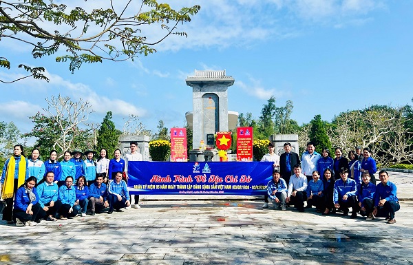 Đại biểu và đoàn viên, thanh niên tham gia Hành trình chụp hình lưu niệm tại Di tích Quốc gia Mộ Cụ Huỳnh Thúc Kháng.