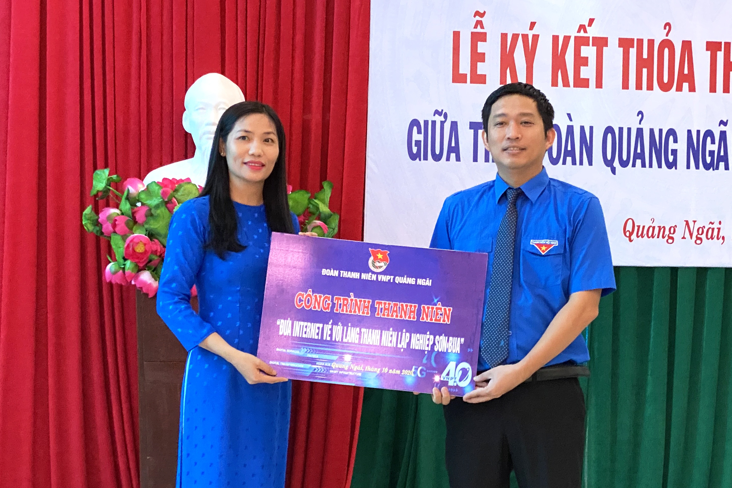 Đoàn Thanh niên VNPT Quảng Ngãi trao bảng tượng trưng công trình thanh niên “Đưa Internet về với Làng Thanh niên lập nghiệp Sơn Bua”.