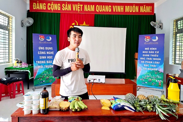 Anh Nguyễn Hùng Cường hướng dẫn người dân sử dụng chế phẩm sinh học IMO để xử lý rác thải hữu cơ giảm lượng rác thải sinh hoạt ra môi trường.