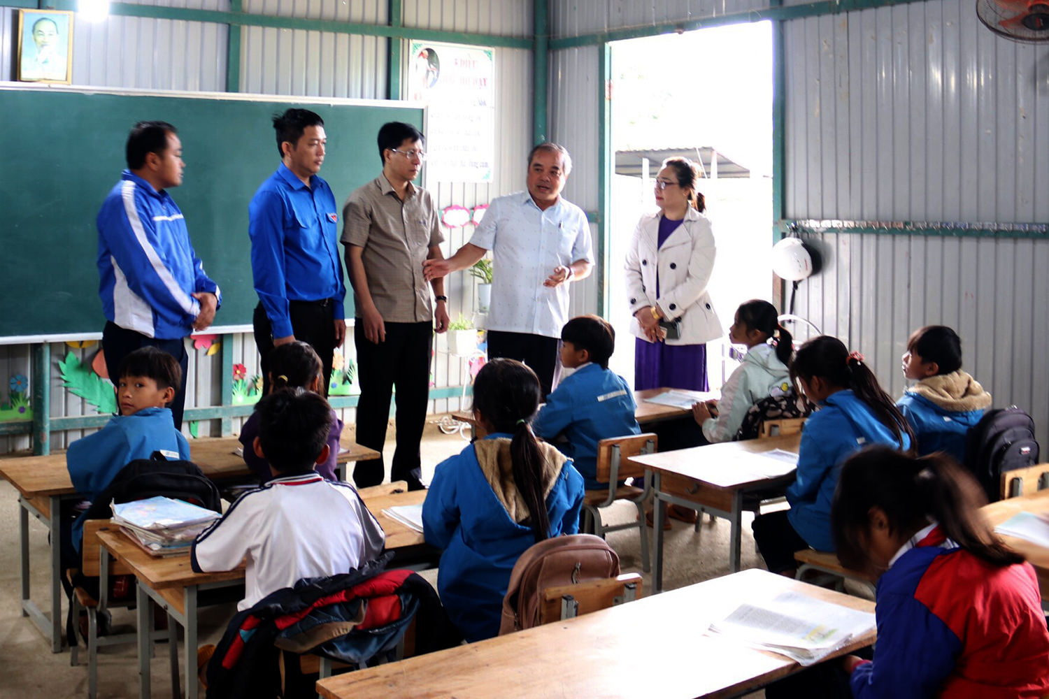 Lãnh đạo UBND tỉnh, Tỉnh đoàn, Hội LHTN Việt Nam tỉnh và Huyện ủy Trà Bồng thăm giáo viên, học sinh tại lớp học mới.