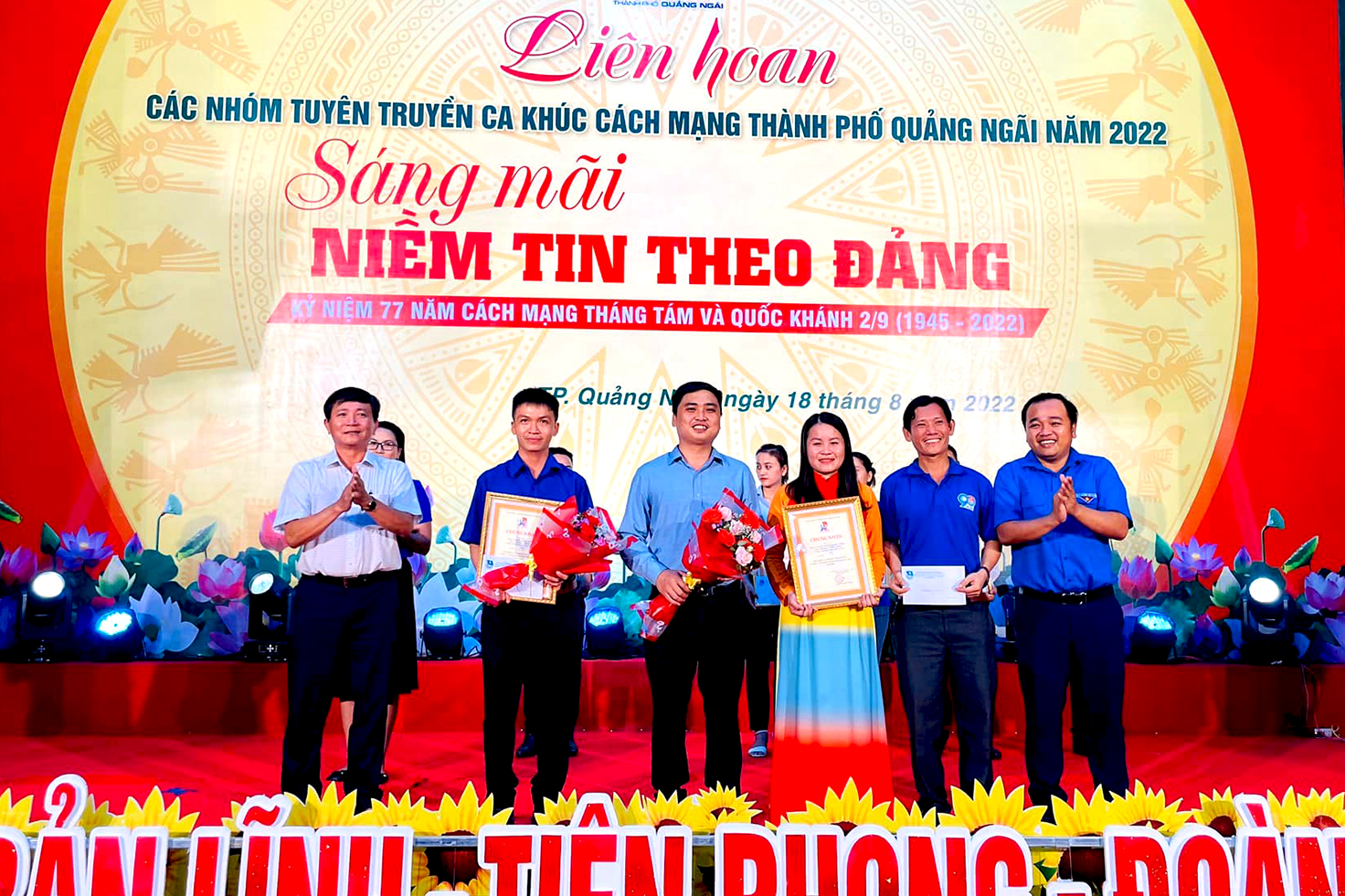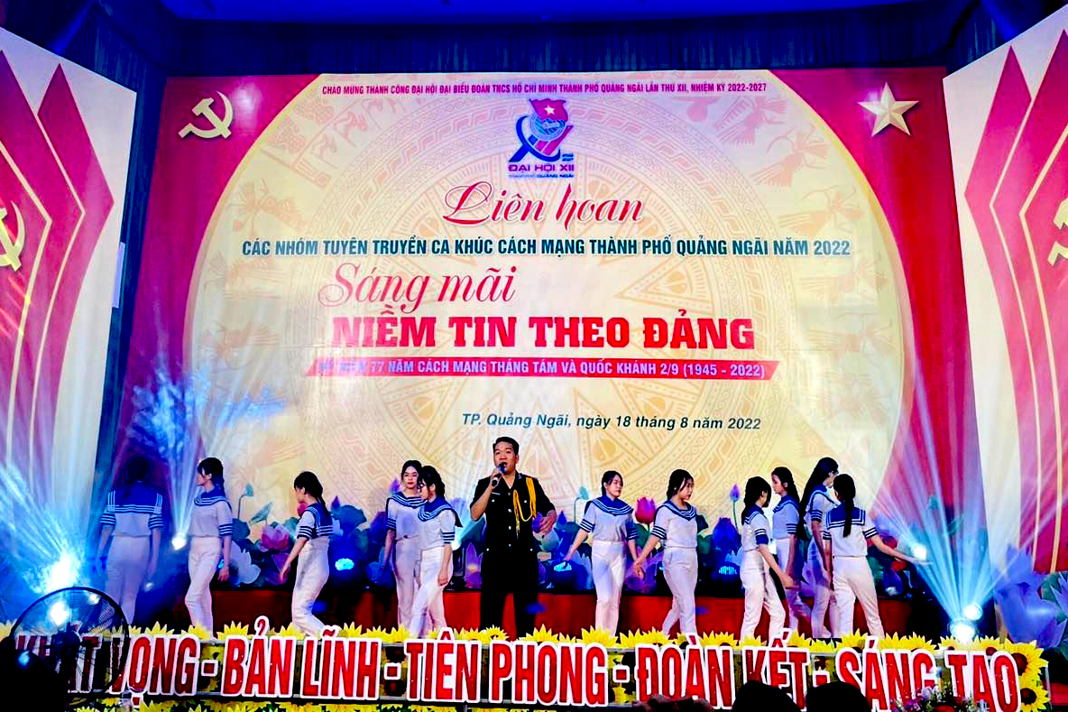 Tối 18/8, tại Trung tâm Hoạt động Thanh thiếu nhi TP.Quảng Ngãi, Ban Thường vụ Thành đoàn Quảng Ngãi tổ chức Liên hoan các nhóm tuyên truyền ca khúc cách mạng TP.Quảng Ngãi năm 2022 chủ đề “Sáng mãi niềm tin theo Đảng”. Đến dự xem chương trình có đồng chí Lê Văn Vin, Phó Bí thư Thường trực Tỉnh đoàn; đồng chí Nguyễn Thị Minh Thương, Bí thư Thành đoàn cùng đông đảo đoàn viên thanh niên.