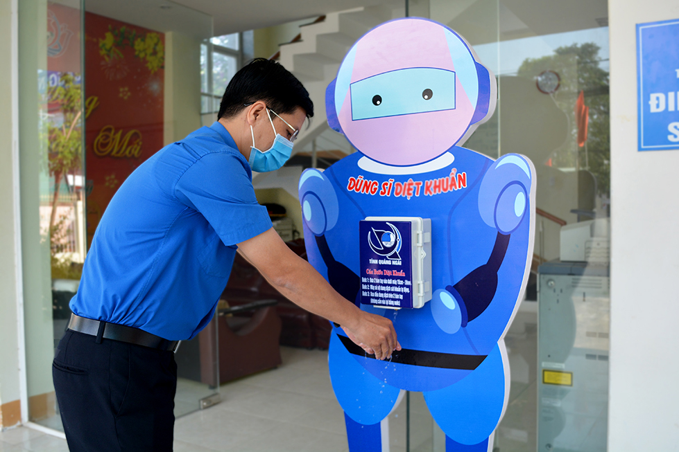 Hội LHTN Việt Nam tỉnh phối hợp cùng anh Võ Trường Tiến (trường Đại học Phạm Văn Đồng) chế tạo mô hình rô bốt “Dũng sĩ diệt khuẩn”, chiếc máy rửa tay sát khuẩn tự động cho nhiều người vừa tiết kiệm nước rửa tay vừa không lo lây nhiễm chéo. Máy phù hợp sử dụng cho những nơi công cộng để phòng chống dịch bệnh COVID-19. Anh Lê Văn Vin, Phó Bí thư Tỉnh đoàn, Chủ tịch HỘi LHTN Việt Nam cho biết, Hội sẽ phối hợp cùng Ban Chỉ đạo phòng chống dịch bệnh COVID-19 của tỉnh sẽ đặt máy tại những điểm chốt kiểm dịch COVID-19 ở các cửa ngõ tỉnh và những nơi công cộng khác như chợ, bến xe…