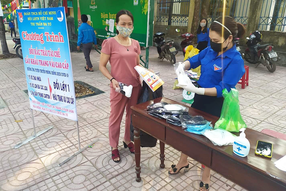 Huyện Tư Nghĩa tổ chức 6 đội hình tuyên truyền, tặng 300 hộp xà phòng, 1.500 khẩu trang; tổ chức 4 chương trình phế liệu đổi lấy khẩu trang, qua đó, đổi 200 khẩu trang, 150 chai nước rửa tay.