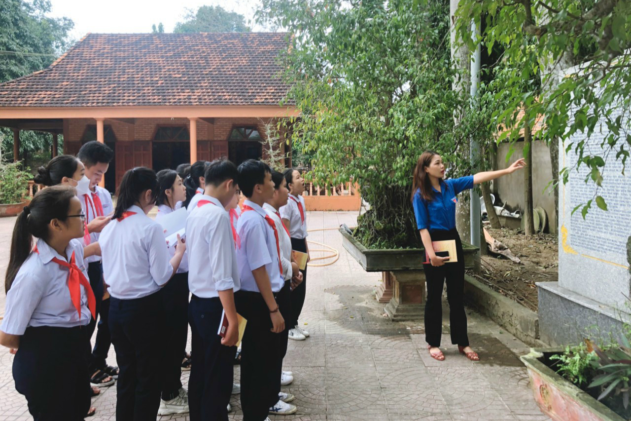 Phó Bí thư Đoàn xã Nghĩa Hòa Trần Thị Quyên hướng dẫn các em thiếu nhi tìm hiểu di tích lịch sử