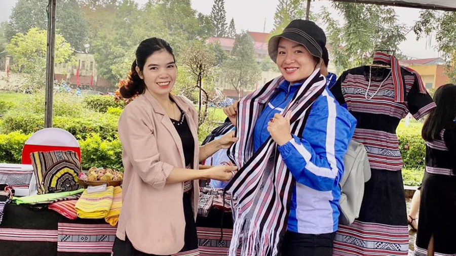 Du khách thích thú với hoa văn độc đáo của trang phục thổ cẩm làng Teng (huyện Ba Tơ).