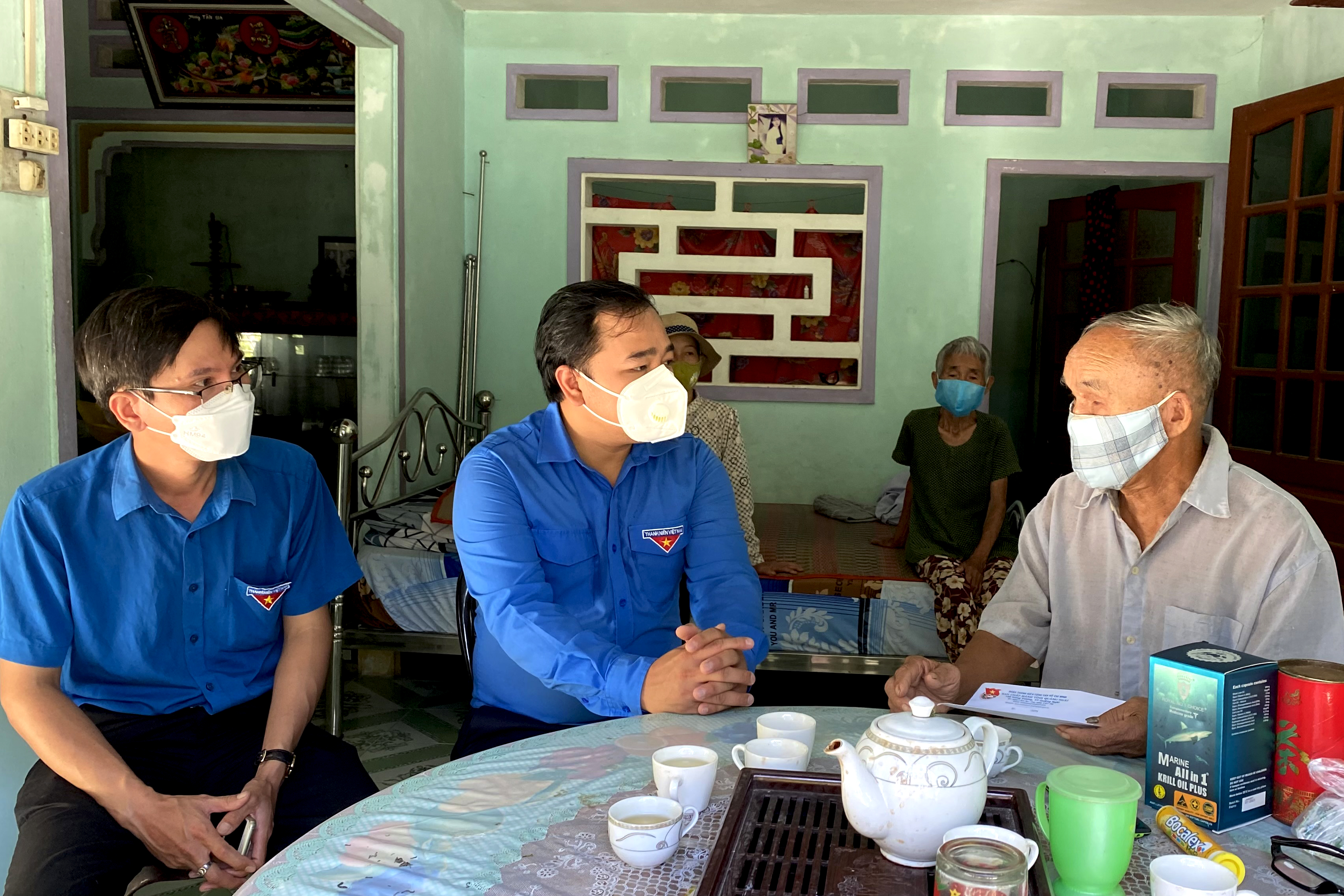 Anh Lê Văn Vin, Phó Bí thư Tỉnh đoàn, Chủ tich Hội LHTN Việt Nam tỉnh và anh Trần Đăng Minh, Ủy viên Ban Thường vụ Tỉnh đoàn, Phó Chủ tịch Hội LHTN Việt Nam tỉnh trao tặng quà cho ông Nguyễn Xinh