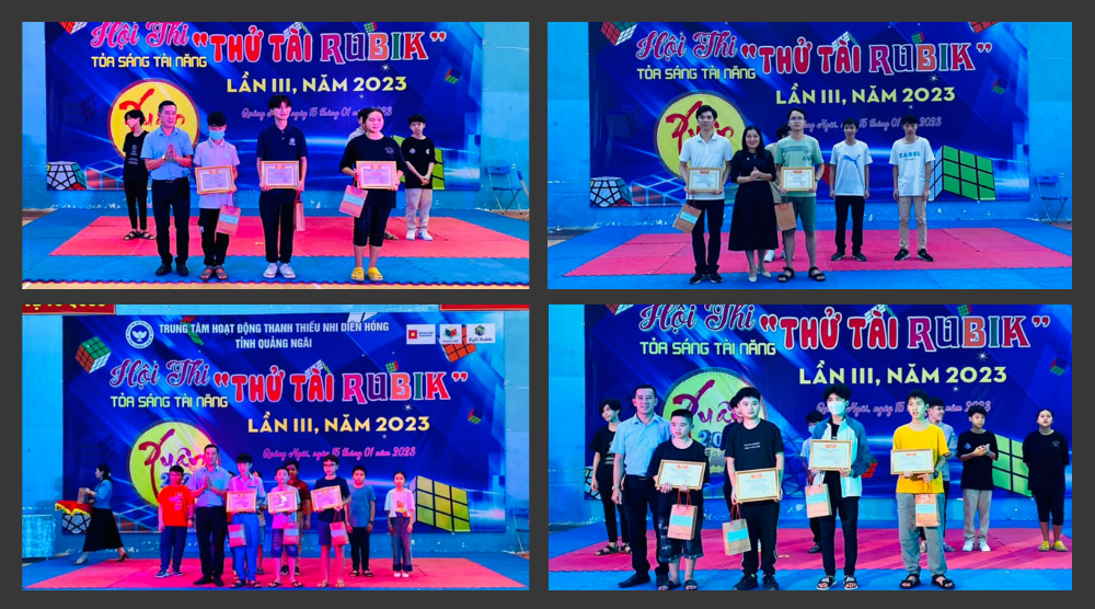 Chung cuộc, với tổng thời gian giải 2 khối rubik 3x3 và 4x4 là 50,801 giây, đấu thủ Võ Nguyên Phát (xã Nghĩa Trung, Tư Nghĩa) đã xuất sắc đoạt giải nhất khối học sinh THCS; giải nhất khối THPT thuộc về đấu thủ Trần Nguyên Bách (THPT Võ Nguyên Giáp, TP.Quảng Ngãi) với thời gian giải là 52,852 giây; em Phạm Nguyên Khang (TH Trần Phú, TP.Quảng Ngãi) giải nhất khối TH với tổng thời gian là 107,016 giây.