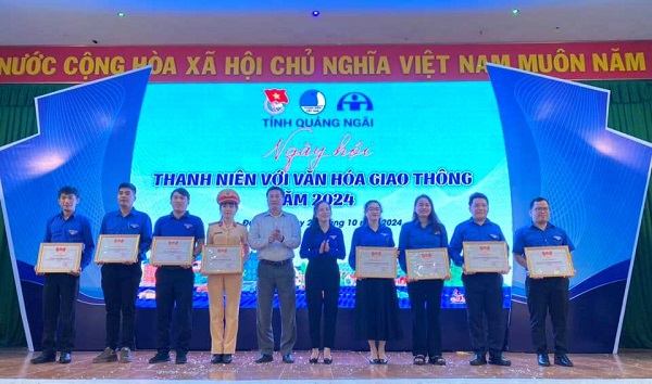 Tỉnh đoàn Quảng Ngãi đã trao tặng bằng khen cho 10 tập thể và 9 cá nhân có thành tích tốt trong tham gia đảm bảo TTATGT năm 2024; trao tặng 500 cuốn vở cho học sinh Trường THPT Số 2 Đức Phổ.