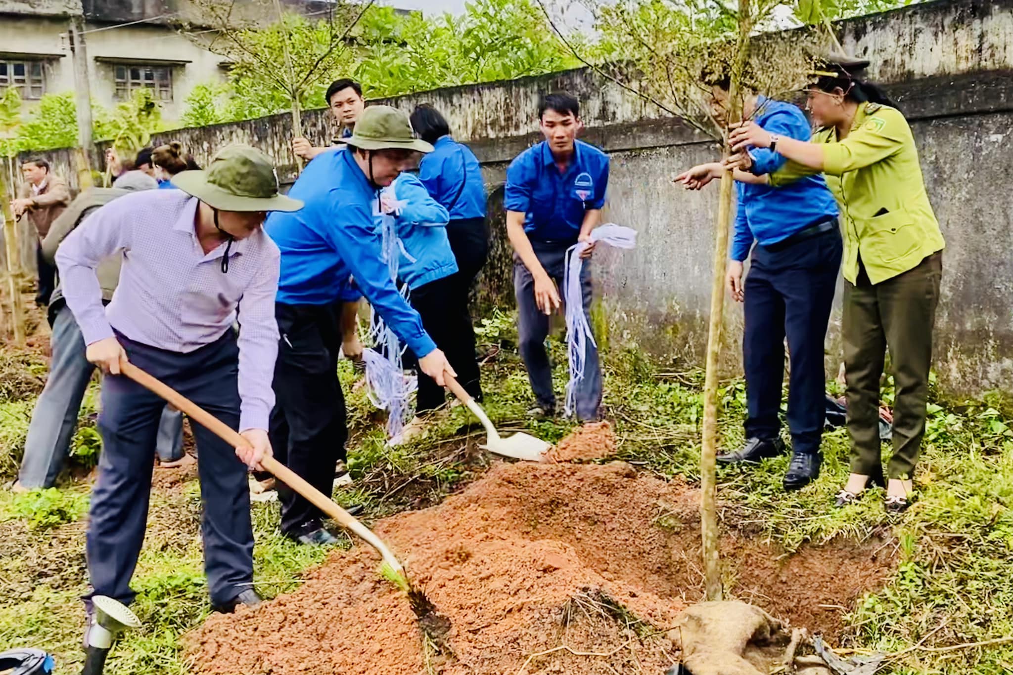 Thường trực Tỉnh đoàn và lãnh đạo Thị ủy Đức Phổ cùng đoàn viên, thanh niên gia trồng cây trong khuôn viên Nhà sinh hoạt truyền thống thôn Mỹ Trang.