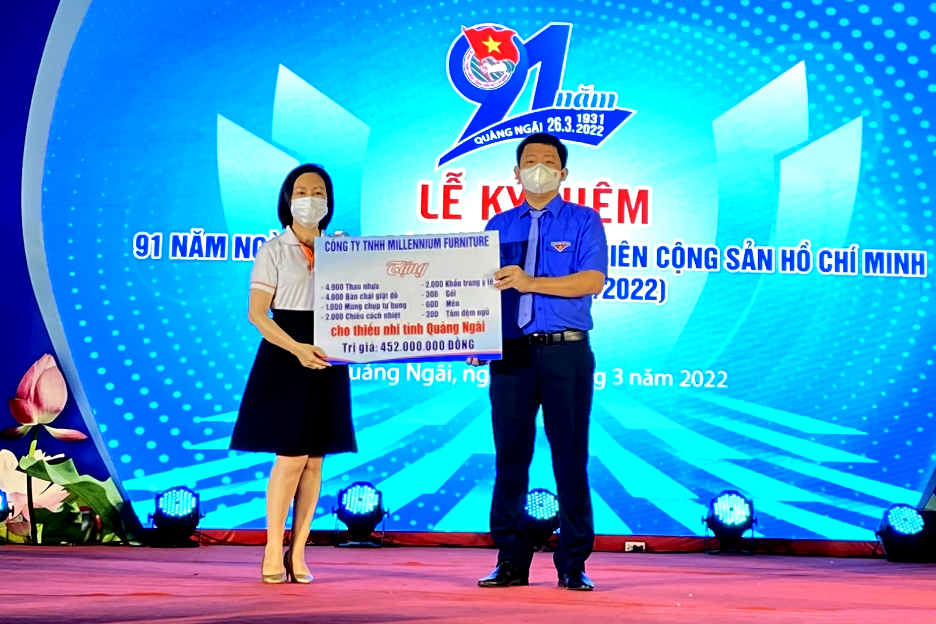 Tại chương trình buổi lễ, Công ty cổ phần đầu tư 577 Quảng Ngãi hỗ trợ 200 triệu đồng cho chương trình “Phổ cập bơi cho em” dịp hè năm 2022 tại huyện Tư Nghĩa và TP Quảng Ngãi; Công ty TNHH Millennium Furniture hỗ trợ 4.900 thau nhựa, 4.000 bàn chải, 2.000 chiếu cách nhiệt, 2.000 hộp khẩu trang y tế, 1.000 mùng chụp, gối, mền, nệm và 01 “Không gian đọc sách” cho thiếu nhi, học sinh trên địa bàn tỉnh với tổng trị giá 452 triệu đồng.
