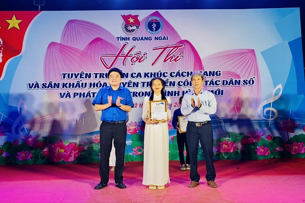 Đồng chí Trần Đăng Minh, Phó Bí thư Tỉnh đoàn và ông Đặng Văn Ngữ, Phó Chi cục trưởng Chi cục Dân số - Kế hoạch tỉnh Quảng Ngãi trao giải cho các đội thi đoạt giải.