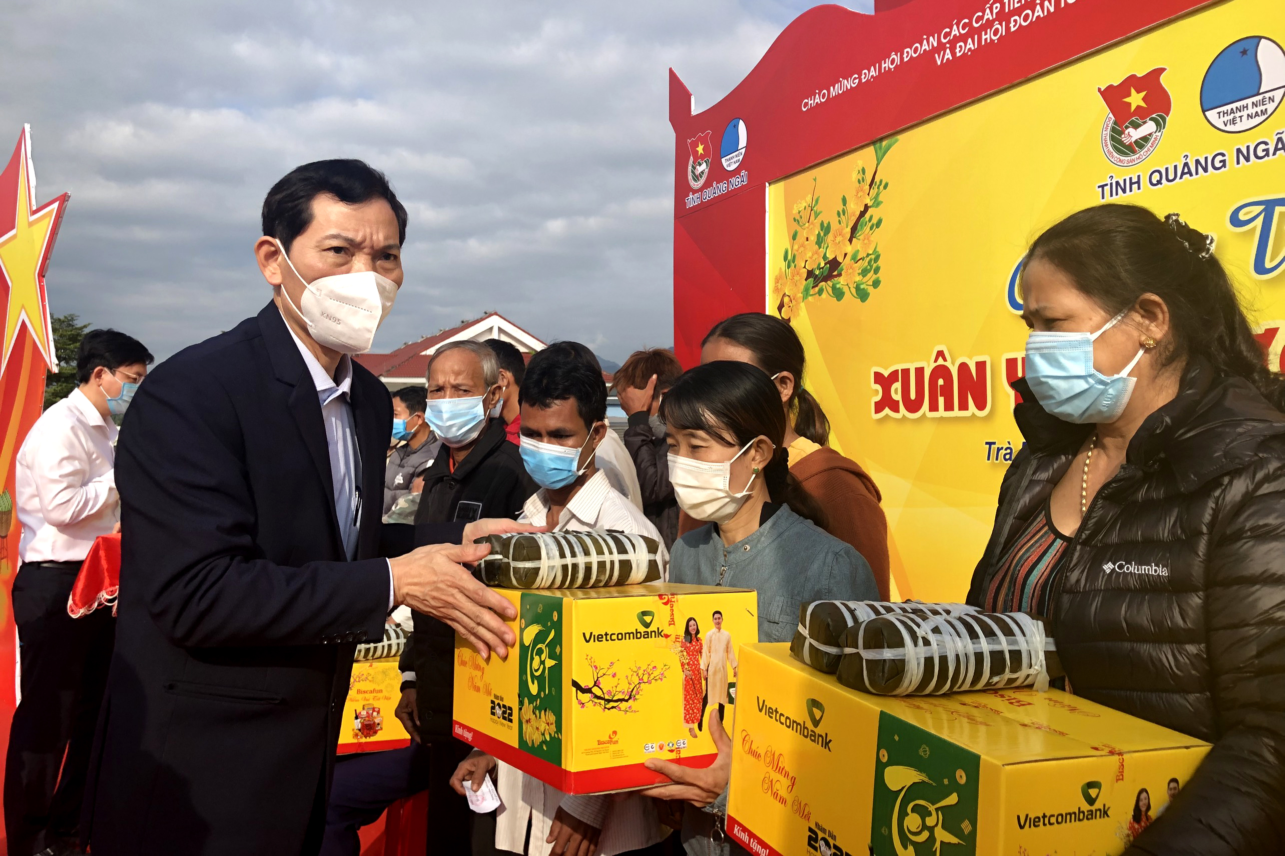 Trong khuôn khổ chương trình “Xuân yêu thương”, Vietcombank Quảng Ngãi, Tỉnh đoàn, Hội LHTN Việt Nam tỉnh cũng dành tặng 100 suất quà cho các gia đình có hoàn cảnh khó khăn tại huyện Trà Bồng mỗi suất quà gồm 300 ngàn đồng và 2 cây bánh tét; 250 bộ áo ấm cho thiếu nhi tại huyện Trà Bồng và huyện Sơn Tây.