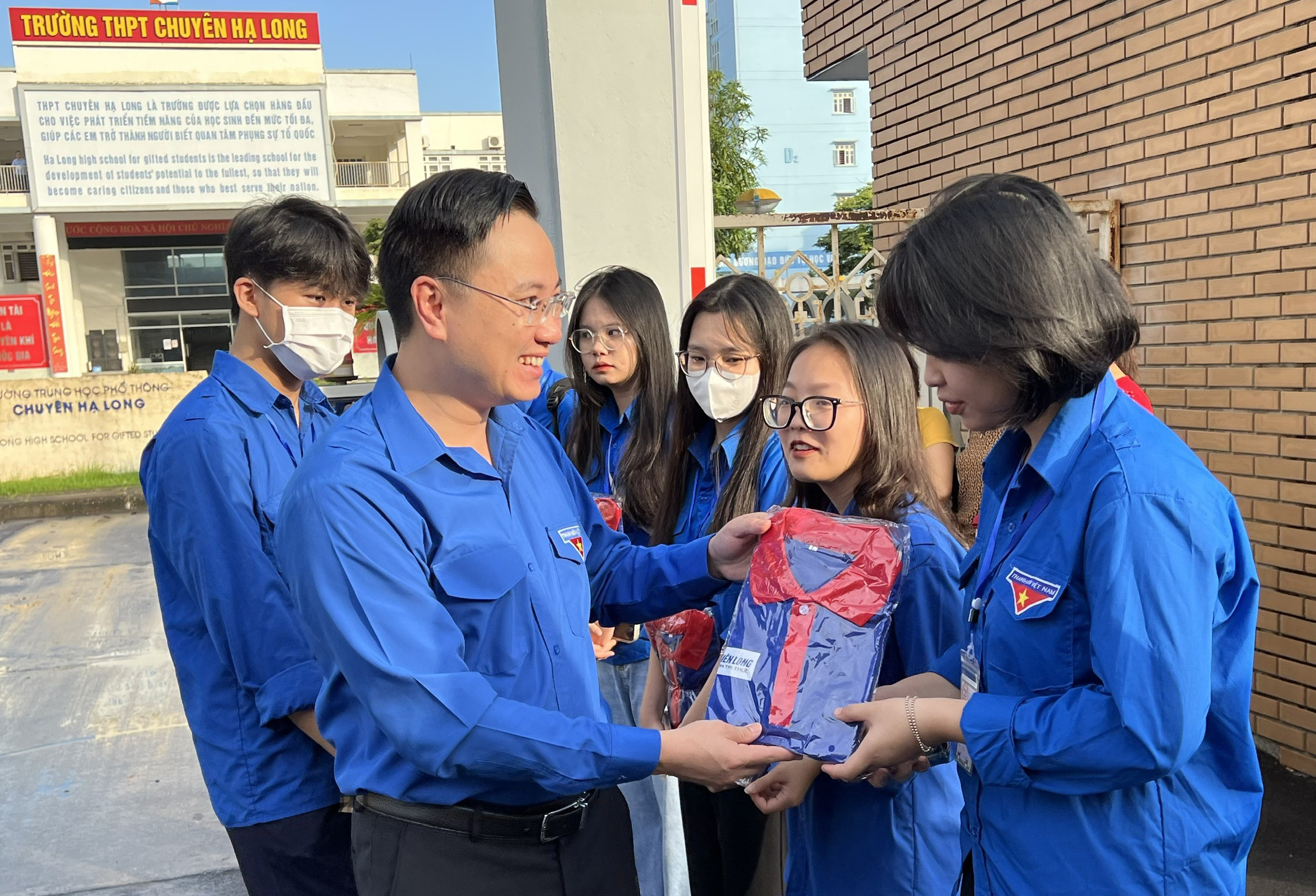 Các đại biểu tặng quà, động viên các đội xung kích tình nguyện tại chương trình ra quân Chiến dịch TNTN hè năm 2023