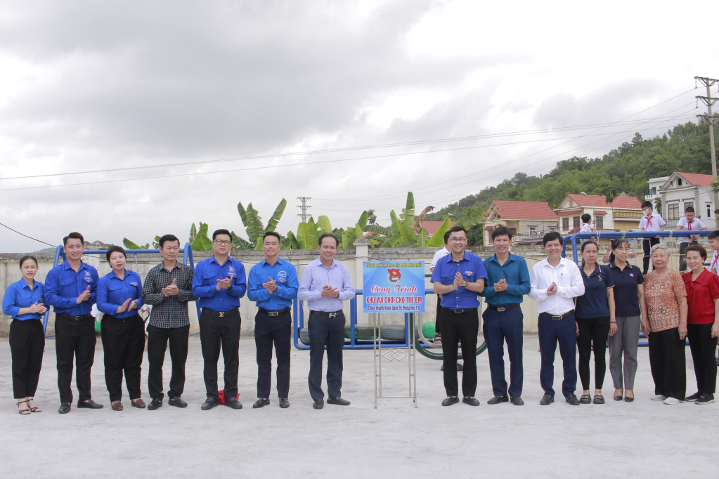 Gắn biển công trình khu vui chơi cho trẻ em tại phường Hồng Phong (TX Đông Triều) tại chương trình ra quân Chiến dịch TNTN hè năm 2023. Ảnh: Chu Linh
