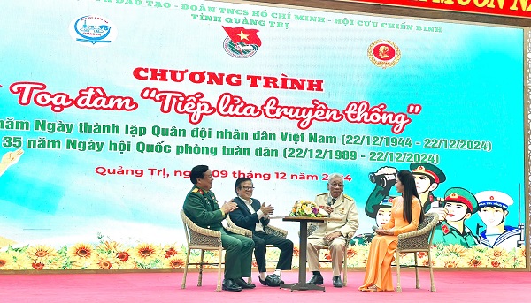 ĐTN: Sáng ngày 09/12/2024, Tỉnh đoàn, Sở Giáo dục và Đào tạo, Hội Cựu chiến binh tỉnh phối hợp tổ chức chương trình toạ đàm “Tiếp lửa truyền thống” - kỷ niệm 80 năm Ngày thành lập Quân đội nhân dân Việt Nam (22/12/1944 - 22/12/2024) và 35 năm Ngày hội Quốc phòng toàn dân (22/12/1989 - 22/12/2024).