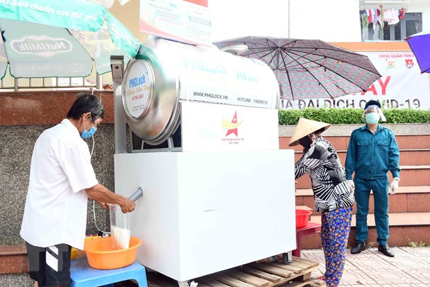 Triển khai cây ATM gạo 0 đồng hỗ trợ người dân nghèo, khó khăn do dịch bệnh. (Ảnh: TTXVN)