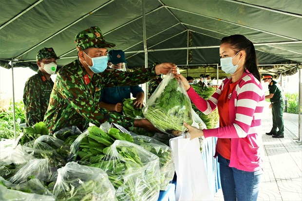 Gian hàng 0 đồng của lực lượng vũ trang Quân khu 7 hỗ trợ người dân nghèo, khó khăn do dịch bệnh. (Ảnh: TTXVN)