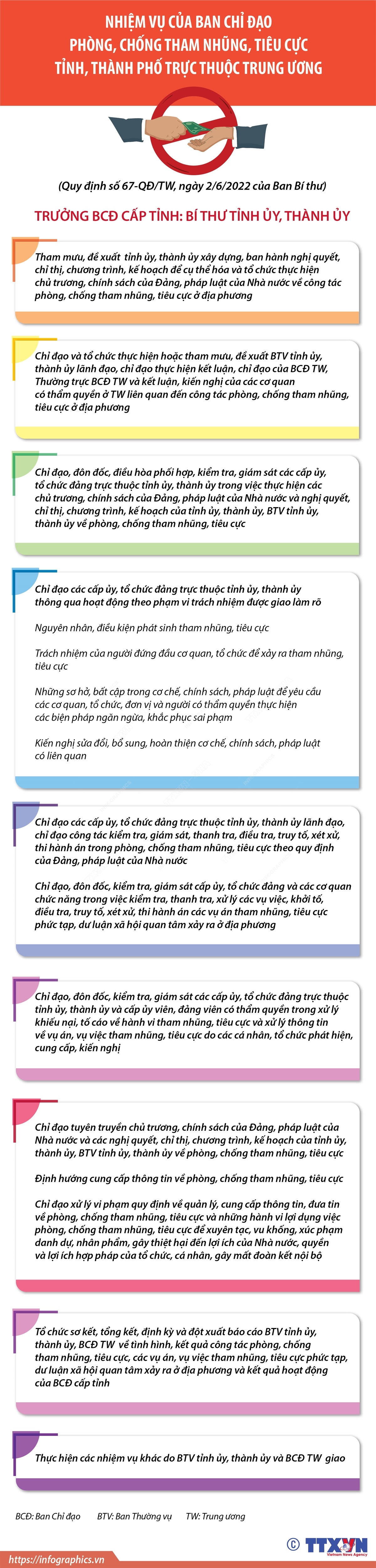 Đại hội XIII của Đảng, Kết luận Hội nghị Trung ương 4 khóa XIII, Quy định số 32-QĐ/TW ngày 16/9/2021 của Bộ Chính trị và nhiều Kết luận của Tổng Bí thư Nguyễn Phú Trọng, Trưởng Ban Chỉ đạo Trung ương về phòng, chống tham nhũng, tiêu cực (Ban Chỉ đạo Trung ương) thời gian gần đây đã nhấn mạnh trọng tâm phải đẩy mạnh phòng và đấu tranh chống tham nhũng, tiêu cực trong cả hệ thống chính trị. Trong đó, tập trung gắn phòng, đấu tranh chống tham nhũng, tiêu cực với phòng và chống sự suy thoái về tư tưởng chính trị, đạo đức, lối sống, "tự diễn biến", "tự chuyển hóa" của cán bộ, đảng viên, công chức, viên chức, trước hết là cán bộ lãnh đạo, quản lý các cấp của các cấp ủy, tổ chức đảng trong hệ thống chính trị. Đi liền cùng đó là phải tạo chuyển biến mạnh mẽ trong công tác phát hiện, xử lý tham ô, tham nhũng, tiêu cực tại địa phương, cơ sở; khắc phục tình trạng trên nóng, dưới lạnh…