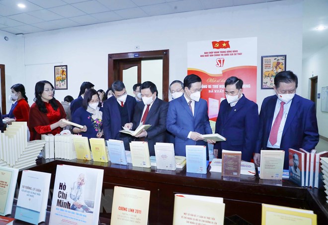 Đồng chí Võ Văn Thưởng, Ủy viên Bộ Chính trị, Thường trực Ban Bí thư, và các lãnh đạo tham dự buổi lễ ra mắt sách. (Ảnh: Phương Hoa/TTXVN)