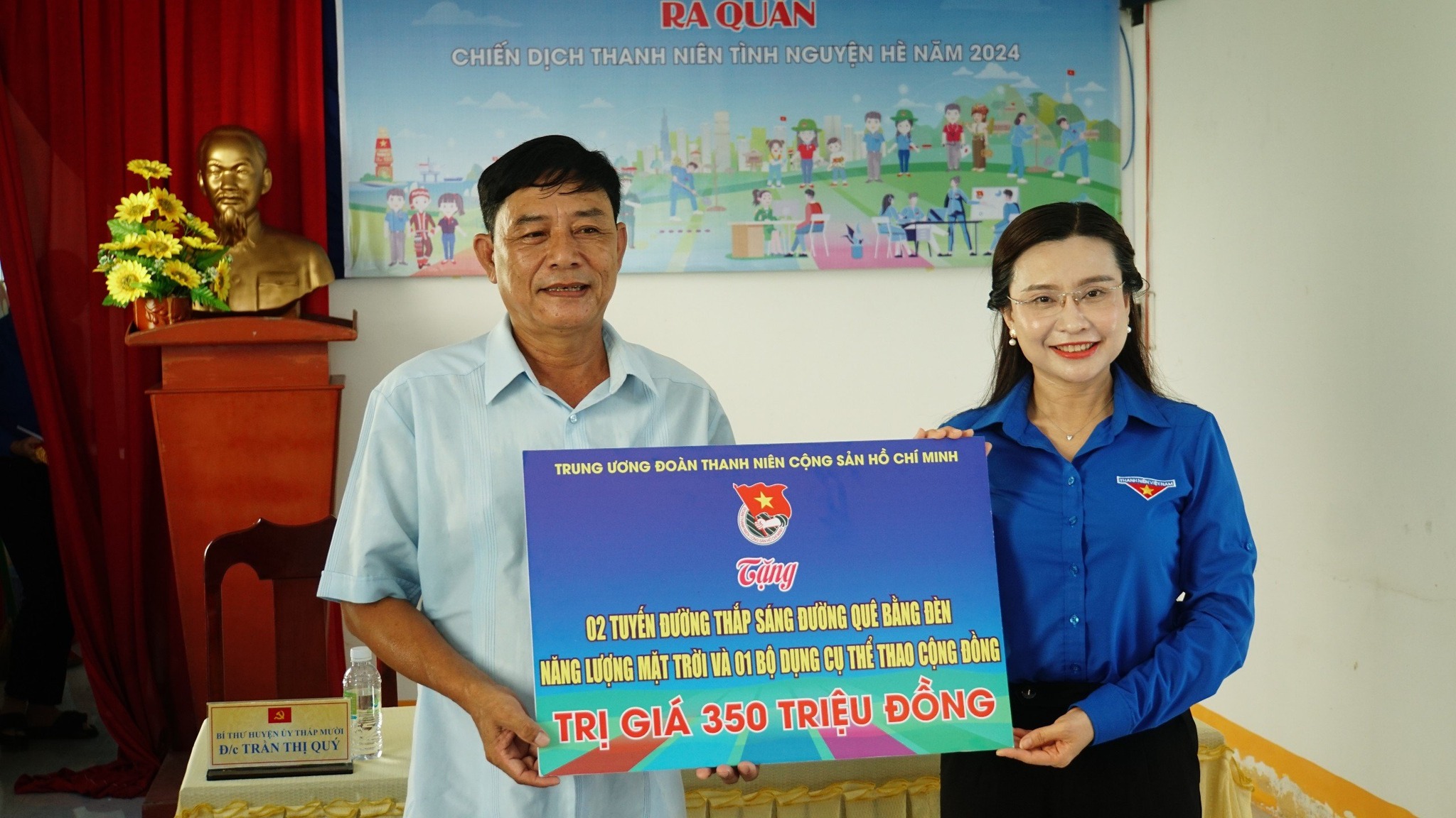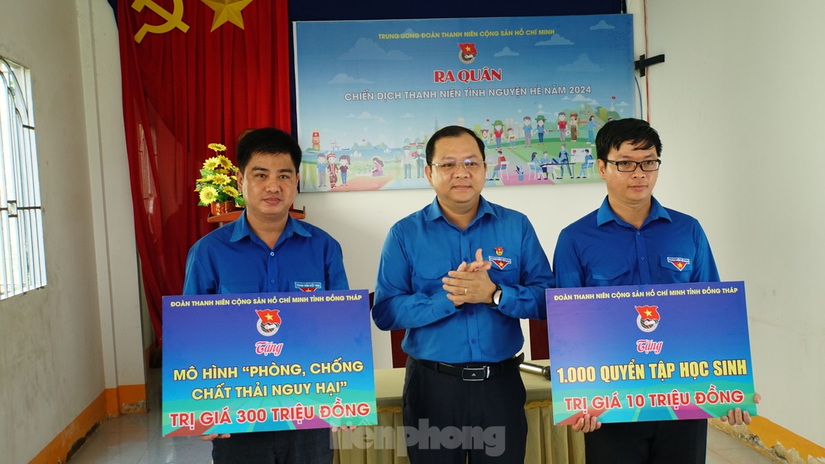 Bên cạnh đó, Ban Thường vụ Tỉnh Đoàn Đồng Tháp trao tặng xã Tân Kiều 1 mô hình phòng chống chất thải nguy hại trị giá 300 triệu đồng và 1.000 quyển vở trị giá 10 triệu đồng để hỗ trợ địa phương triển khai các hoạt động trong chiến dịch Thanh niên tình nguyện Hè năm 2024.
